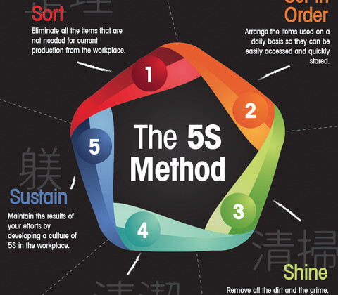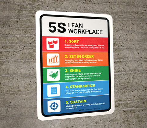 5S stands for Sort, Set in Order, Shine, Standardize, and Sustain. These steps establish procedures for organizing and maintaining the workplace and help continually improve production so you can increase efficiency.